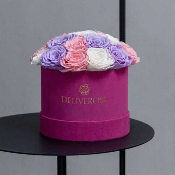 Timeless Hot Pink Suede Dome Box with Lavender, Ivory, and Pink Roses