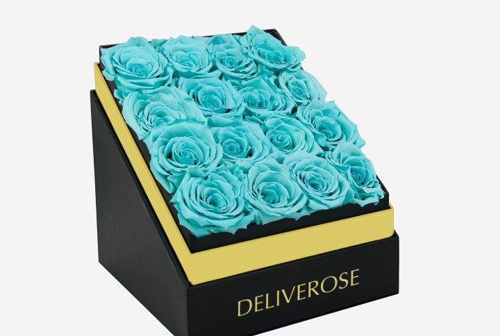 Our Timeless collection exemplifies this refined simplicity with a gold box brimming with long-lasting turquoise blue roses.